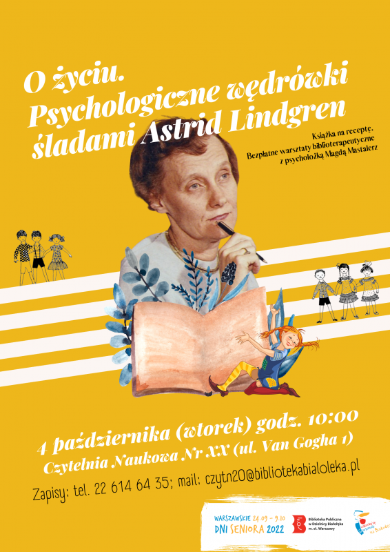 To zajęcia biblioterapeutyczne skierowane do seniorów – najbliższe odbędą się 4 października (wtorek) o godz. 10:00 w Czytelni Naukowej Nr XX (ul. Van Gogha 1). Temat to “O życiu. Psychologiczne wędrówki śladami Astrid Lindgren”) więc czeka nas bardzo ciekawe spotkanie!