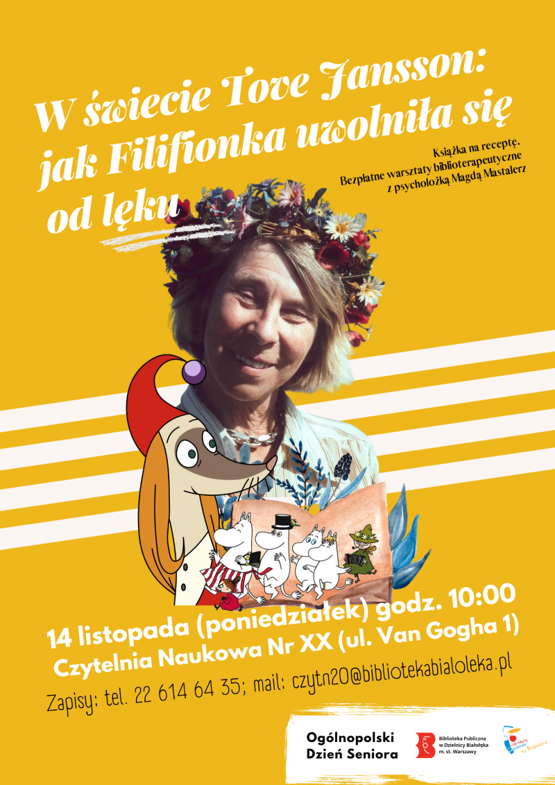 Serdecznie zapraszamy na spotkanie w ramach cyklu “Książka na receptę”. To zajęcia biblioterapeutyczne skierowane do seniorów – najbliższe odbędą się 14 listopada (poniedziałek) o godz. 10:00 w Czytelni Naukowej Nr XX (ul. Van Gogha 1). Temat to “W świecie Tove Jansson: jak Filifionka uwolniła się od lęku”, więc czeka nas bardzo ciekawe spotkanie!