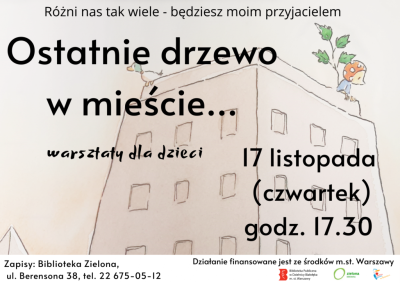 17 listopada zapraszamy dzieci do Biblioteki Zielonej na kolejne warsztaty w ramach projektu Różni nas tak wiele – będziesz moim przyjacielem, finansowanego ze środków m.st. Warszawy. Dzieci będą tworzyć zielone zakątki miasta i przenosić je na makietę. Będą ekologiczne zabawy, ciekawe opowieści a każdy wyjdzie z warsztatów z własnym drzewkiem.