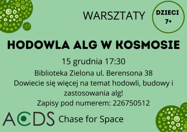 Zapraszamy dzieci 7+ na warsztaty o specjalnej odmianie alg, które będą wykorzystywane przez astronautów do oczyszczania powietrza w kapsule kosmicznej. Uczestnicy dowiedzą się, jakie znaczenie ma jakość powietrza w statku kosmicznymi, zbudują swój model bioreaktora i dowiedzą się wielu ciekawych rzeczy o życiu astronautów w kosmosie w czasie misji.