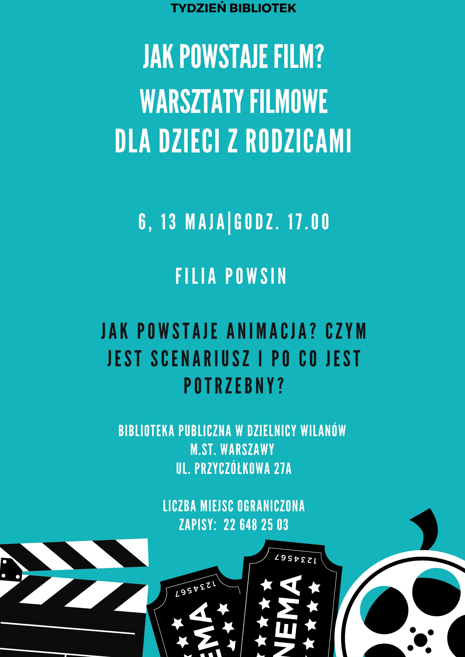 Zapraszamy na warsztaty kreatywne, podczas których zajrzymy za kulisy filmowego świata. Zastanowimy się, jakie są rodzaje animacji i jak powstaje iluzja ruchu. Uczestnicy warsztatów będą mogli stworzyć własną animację, skonstruować proste zabawki optyczne, czy wcielić się w rolę scenarzystów. Podczas warsztatów odkryjemy, co może łączyć książkę i film. Dowiemy się także, na co warto zwracać uwagę podczas projekcji.