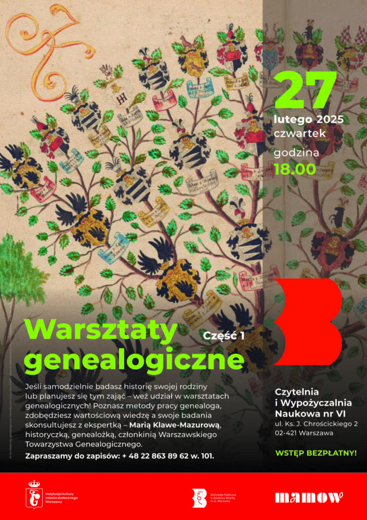 Pierwsza część z cyklu „Warsztatów genealogicznych” odbędzie się w czwartek 27 lutego 2025 o godz. 18.00 w Czytelni i Wypożyczalni Naukowej nr VI.
