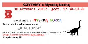 Zapraszamy dzieci w wieku 3-10 lat z rodzicami na spotkanie z MYSZKĄ NORKĄ. Będzie to gratka dla fanów dinozaurów – gdyż punktem wyjścia będą te, właśnie, prehistoryczne gady. Odpowiemy sobie na wiele pytań: Jakby to było gdyby dinozaury nie wyginęły? Czy moglibyśmy się z nimi zaprzyjaźnić i wspólnie żyć na ziemi? Zapraszamy na literackie spotkanie, łączące w sobie dobrą zabawę, filozoficzne rozmyślania, odważne pomysły i żywą dyskusję o zmieniającym się świecie.