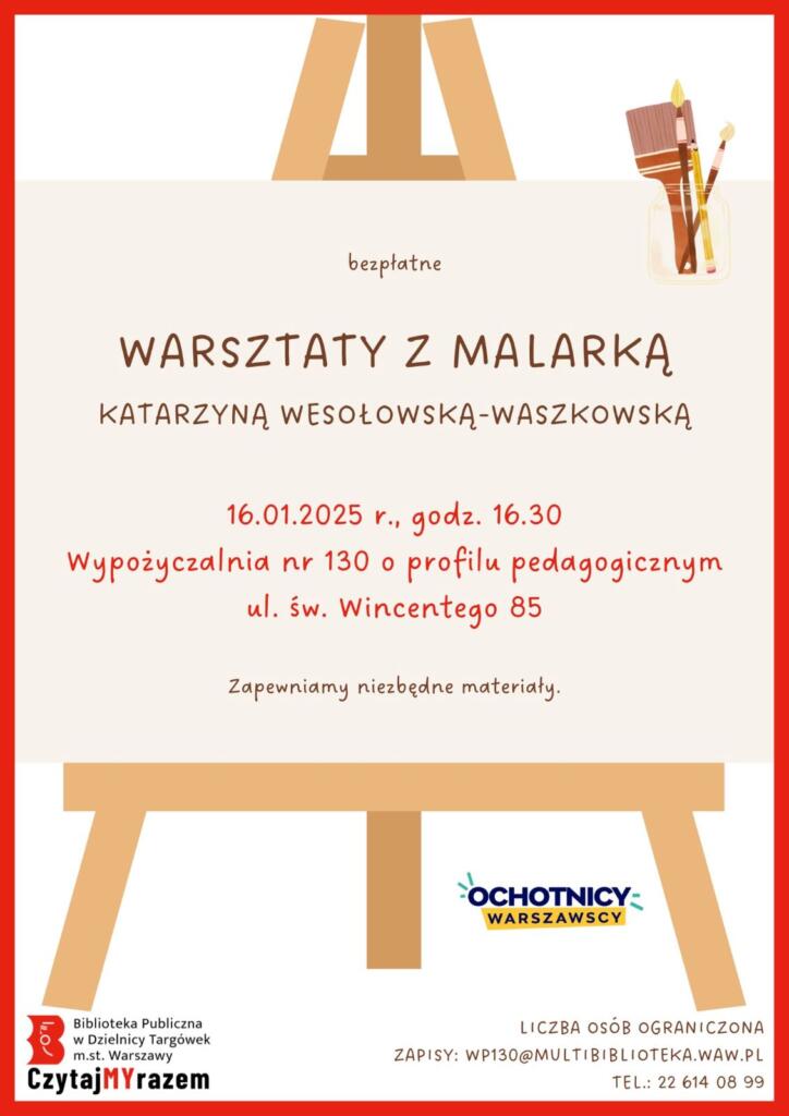 Zapraszamy na bezpłatne warsztaty malarskie z Katarzyną Wesołowską-Waszkowską. Zapewniamy wszystkie materiały.