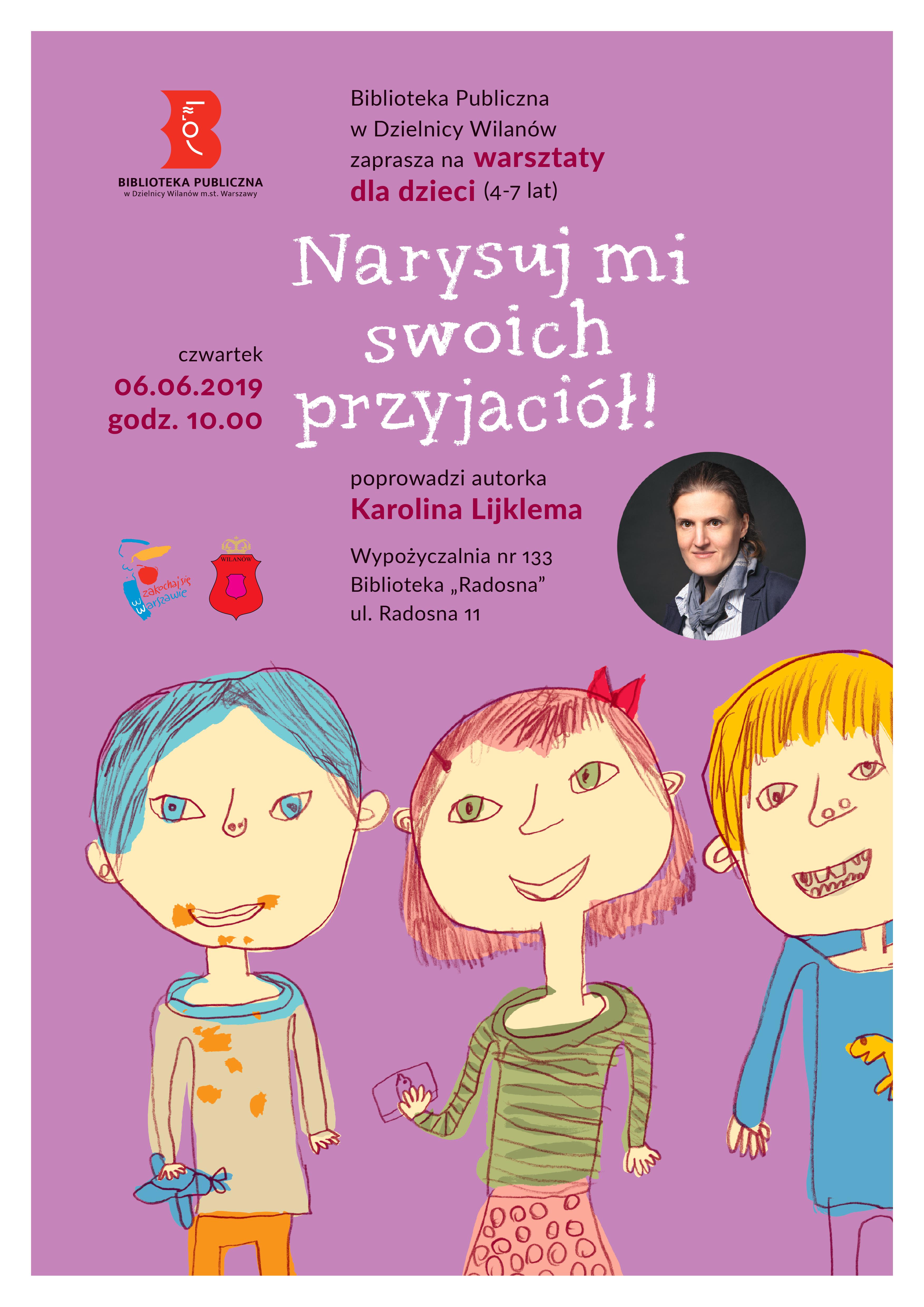 6 czerwca o godzinie 10:00 filia Biblioteki przy ul. Radosnej 11 zaprasza na warsztaty „Narysuj mi swoich przyjaciół!”, prowadzone przez Karolinę Lijklemę.