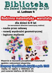 Zapraszamy więc na warsztaty z Rodzinnej Matematyki. Startujemy 18 października o godzinie 17:45! Liczba miejsc ograniczona.