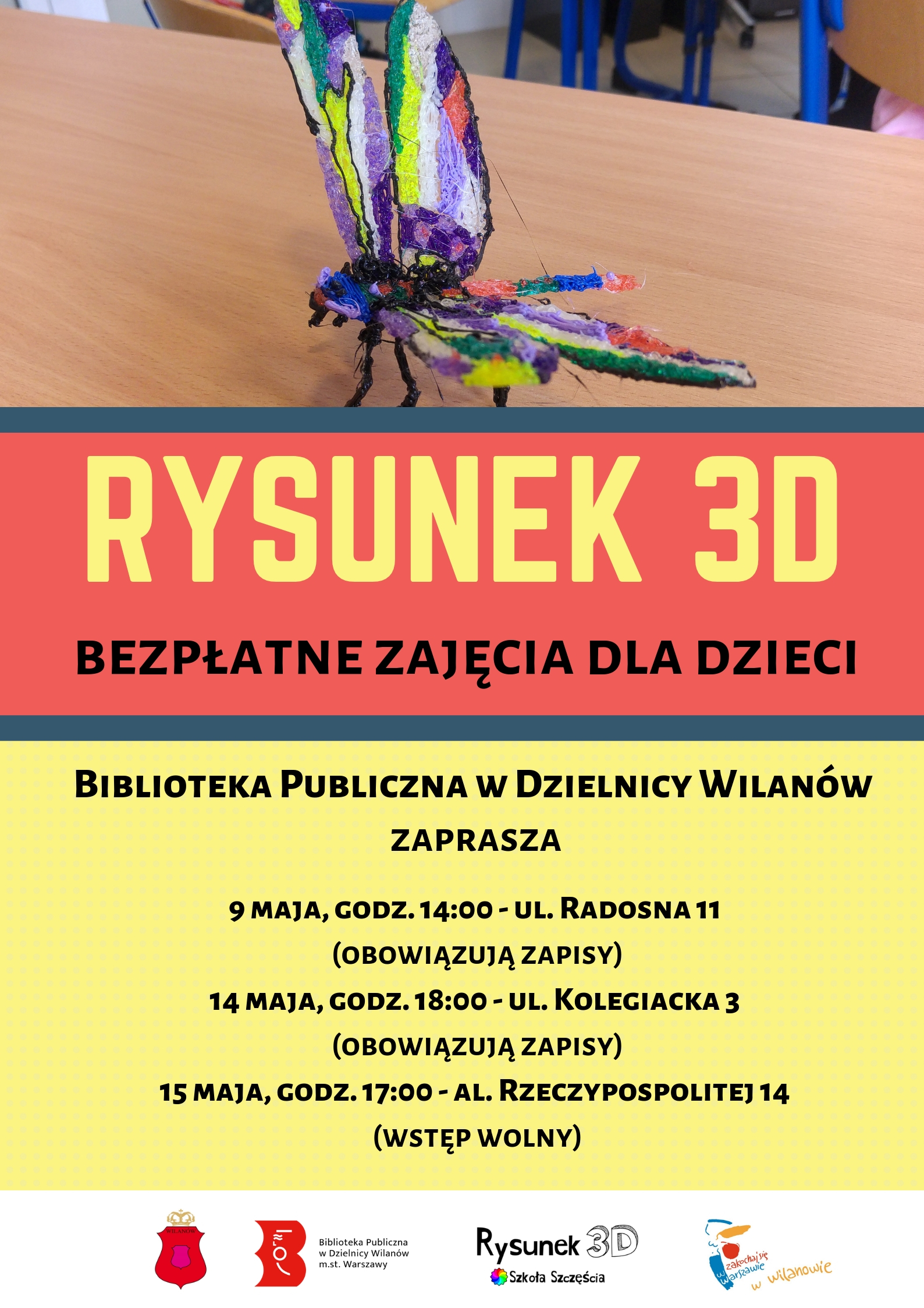 Zastanawialiście się kiedyś, jak tworzy się przedmioty? Czy potrafilibyście wykonać np. długopis, prostą zabawkę lub szkielet dinozaura? Macie bogatą wyobraźnię i lubicie zajęcia manualne? Biblioteka Publiczna w Dzielnicy Wilanów wraz ze Szkołą Szczęścia zapraszają na warsztaty rysunku 3D dla dzieci. Zajęcia to nie tylko doskonały sposób na spędzenie wolnego czasu, ale i wspaniała zabawa oraz świetna okazja do niczym nieograniczonej twórczości. Warsztaty kształcą umiejętność koncentracji, podejmowania wyzwań, planowania, tworzenia i kreatywnego myślenia. Podczas spotkania puścimy wodze fantazji. Zaprojektujemy i za pomocą długopisów 3D stworzymy wspaniałe dzieła z naszych marzeń i snów. Zajęcia odbędą się w następujących terminach: