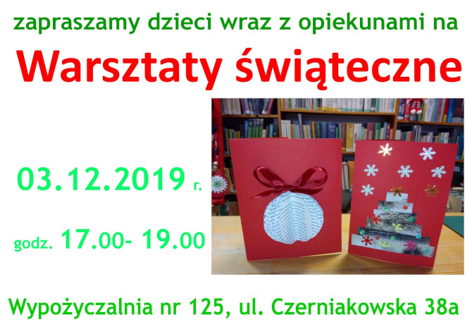 Zapraszamy naszych najmłodszych czytelników warsztaty plastyczne. Razem z dziećmi i ich opiekunami będziemy tworzyć niepowtarzalne kartki świąteczne.