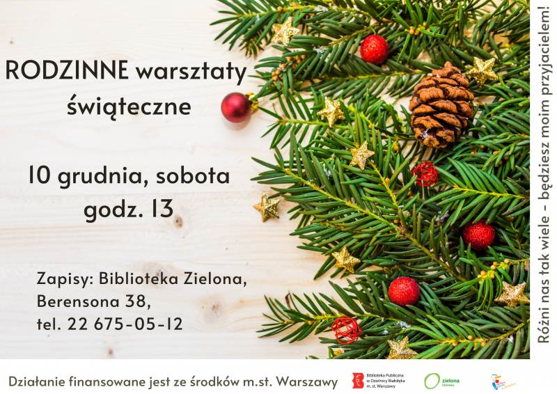 Zapraszamy na rodzinne warsztaty świąteczno-florystyczne, które poprowadzi Edyta Kamieńska-Urazińska. Będziemy robić świąteczne wieńce! Zajęcia odbędą się 10 grudnia w godz. 13-14.30 w ramach projektu „Różni nas tak wiele – będziesz moim przyjacielem!”.