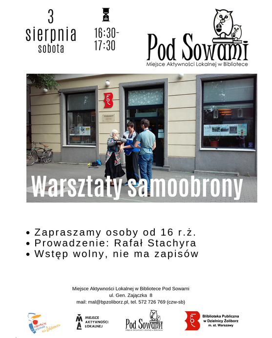 Biblioteka Publiczna w Dzielnicy Żoliborz m.st. Warszawy zaprasza na bezpłatne zajęcia samoobrony z wykorzystaniem technik Wing Tsun dla mieszkańców Żoliborza i okolic, prowadzone przez Rafała Stachyrę.