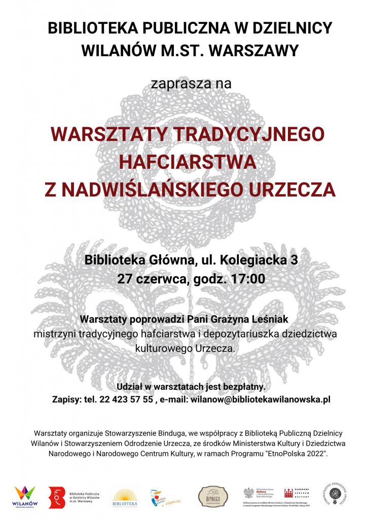 Wraz ze Stowarzyszeniem Binduga i Stowarzyszeniem Odrodzenie Urzecza zapraszamy do wzięcia udziału w darmowym warsztacie z hafciarstwa z nadwiślańskiego Urzecza. Warsztat poprowadzi mistrzyni hafciarstwa i oficjalna depozytariuszka tego dziedzictwa, wpisanego na listę Ministerstwa Kultury, Pani Grażyna Leśniak.