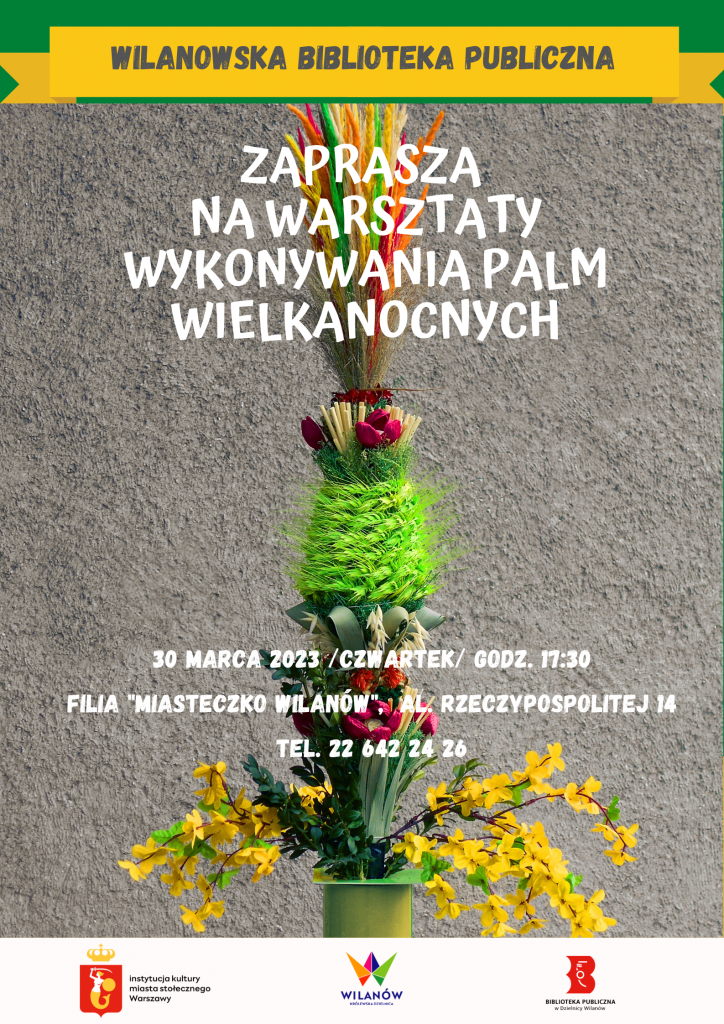 Zapraszamy zatem rodziny do wzięcia udziału w organizowanych w Miasteczku Wilanów warsztatach wykonywania palm wielkanocnych. Widzimy się we czwartek 30 marca o godz. 17:30 w filii Biblioteki w Miasteczku Wilanów.