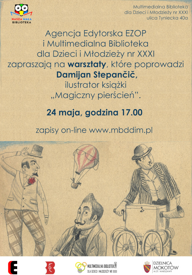 Agencja Edytorska EZOP i Multimedialna Biblioteka nr XXI zapraszają na warsztaty, które poprowadzi Damijan Stepančič, ilustrator książki „Magiczny pierścień”.