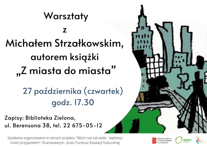 Serdecznie zapraszamy dzieci na warsztaty z Michałem Strzałkowskim, autorem książki „Z miasta do miasta. Historie z czterech stron świata” wydanej przez wydawnictwo Dwie Siostry, które odbędą się 27 października o godz. 17.30 w Zielonej! Ruszyły zapisy, zapraszamy! Spotkanie organizowane w ramach projektu „Różni nas tak wiele – będziesz moim przyjacielem”, finansowanym przez Fundusz Edukacji Kulturalnej.