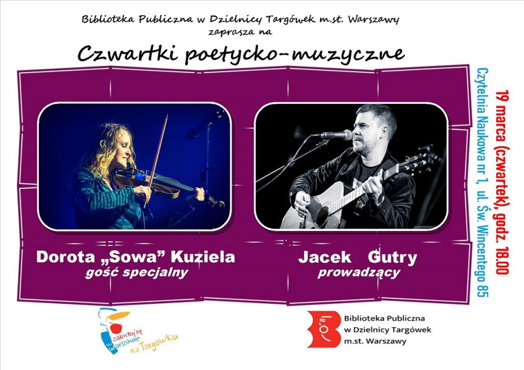 Podczas czwartkowego spotkania Dorota „Sowa” Kuziela zaprezentuje wybrane utwory z wydanej w ubiegłym roku autorskiej płyty „Nigdy nic nie wiadomo” oraz kompozycje do tekstów ulubionych poetów. Więcej informacji o artystce jest dostępnych na stronie: https://www.facebook.com/dorotasowakuziela/