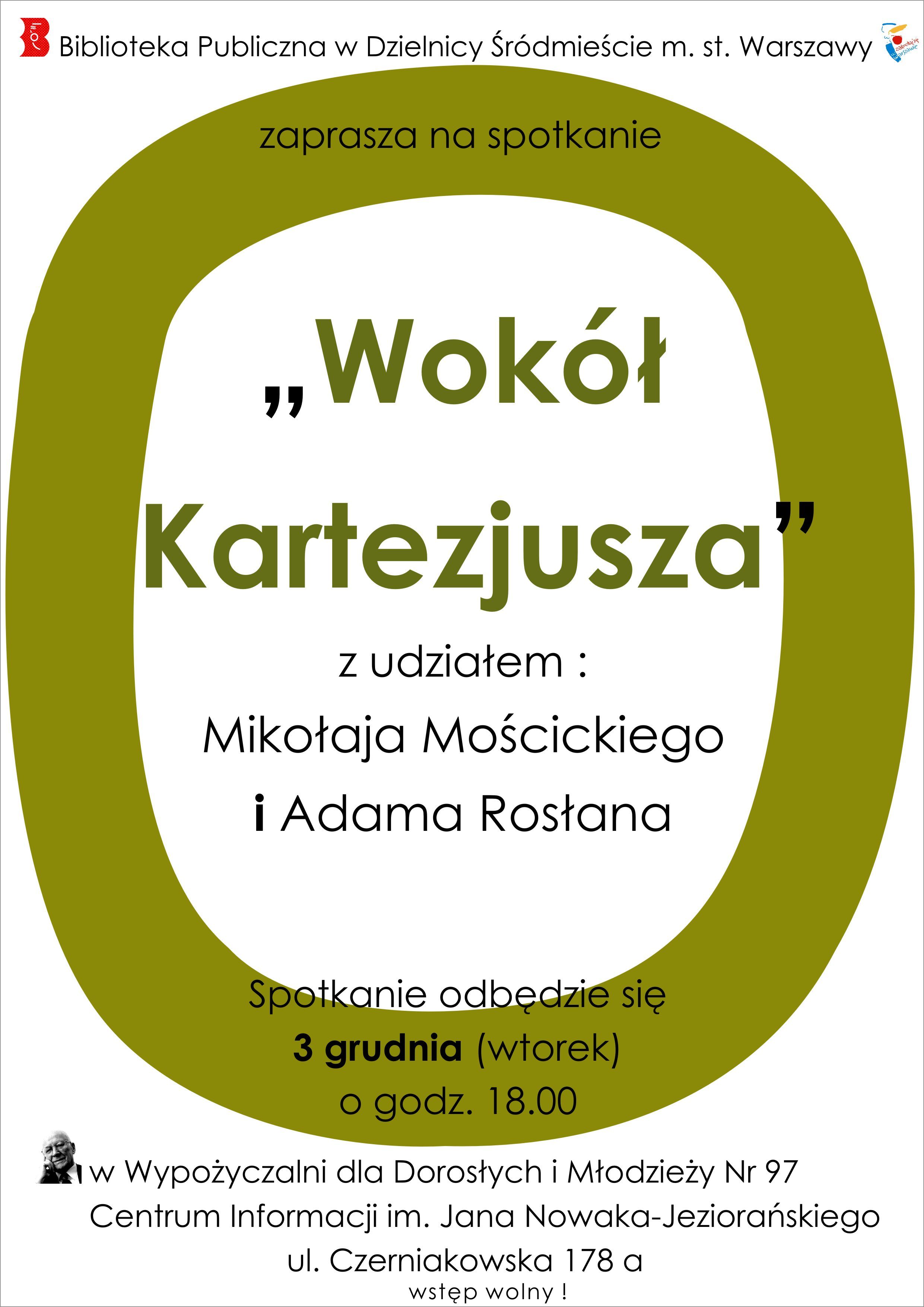 Biblioteka Publiczna w Dzielnicy Śródmieście m.st. Warszawy zaprasza we wtorek 3 grudnia o godzinie 18:00, do Wypożyczalni dla Dorosłych i Młodzieży nr 97 przy ulicy Czerniakowskiej 178A, na spotkanie pt. „Wokół Kartezjusza” z udziałem Mikołaja Mościckiego i Adama Rosłana.