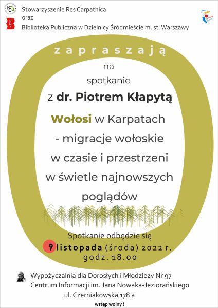 Stowarzyszenie Res Carpathica oraz Biblioteka Publiczna w Dzielnicy Śródmieście m.st. Warszawy zapraszają na spotkanie z dr. Piotrem Kłapytą. Tematem będą „Wołosi w Karpatach – migracje wołoskie w czasie i przestrzeni w świetle najnowszych poglądów”.
