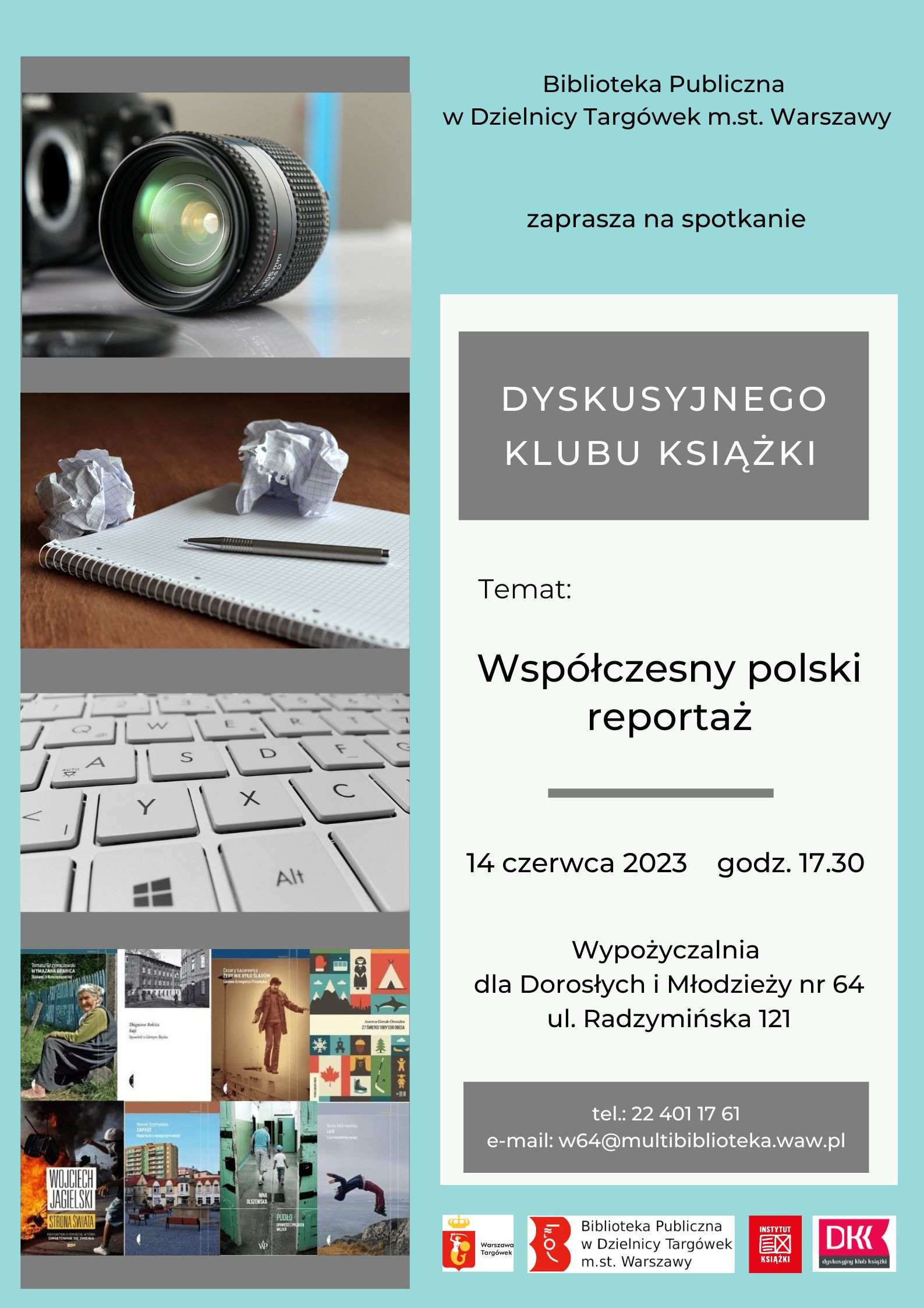 na plakacie zdjęcia obiektywu aparatu fotograficznego, notes, długopis i zwinięte w kulkę kartki papieru, klawiatura, okładki książek; Plakat - zaproszenie na spotkanie Dyskusyjnego Klubu Książki: „Współczesny polski reportaż”. 14 czerwca (środa) 2023 roku, godz. 17.30, Wypożyczalnia dla Dorosłych i Młodzieży nr 64 przy ul. Radzymińskiej 121.