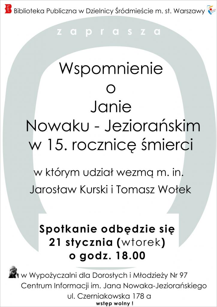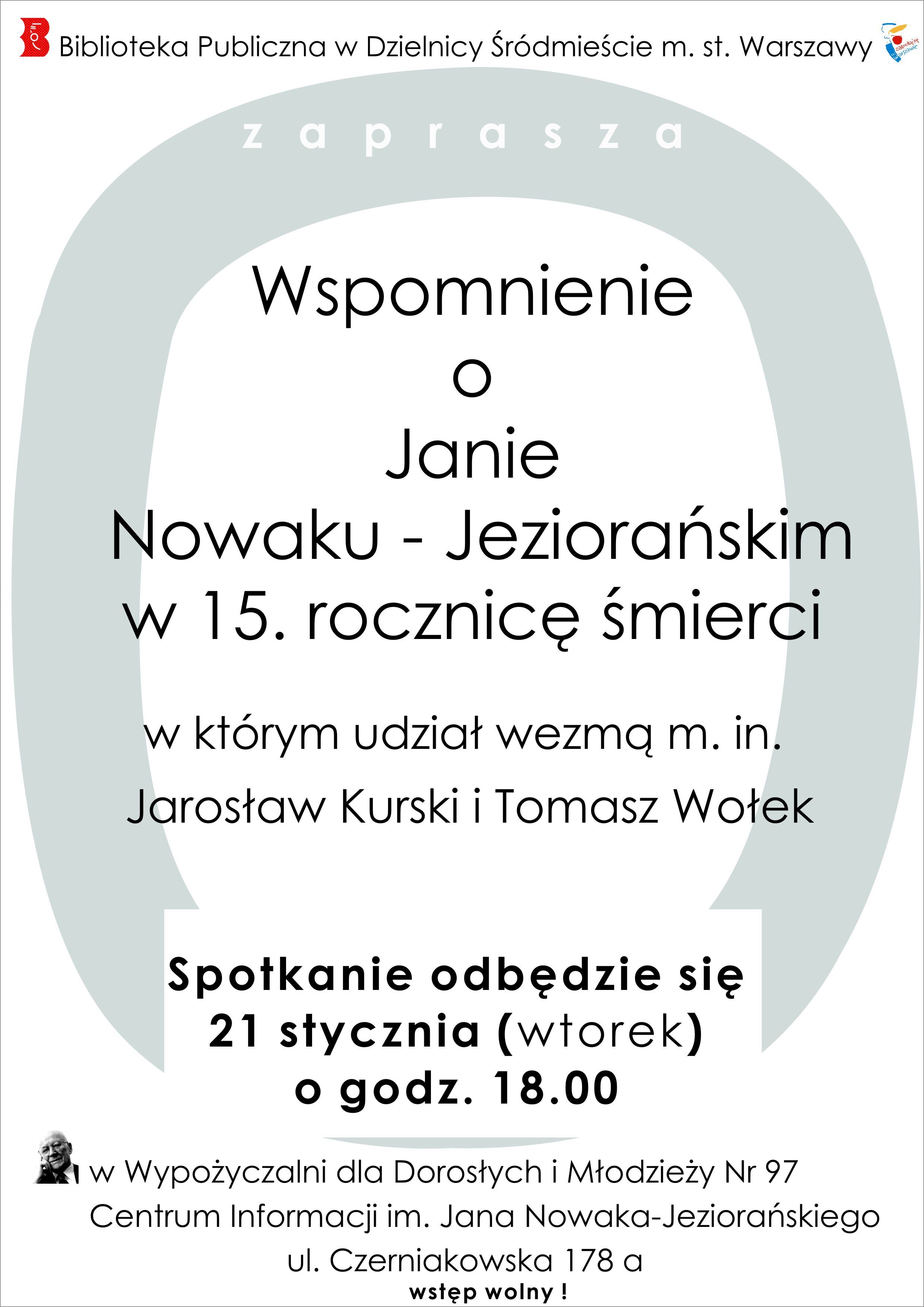 Biblioteka Publiczna w Dzielnicy Śródmieście m.st. Warszawy zaprasza we wtorek 21 stycznia o godzinie 18:00 do Wypożyczalni dla Dorosłych i Młodzieży nr 97, przy ulicy Czerniakowskiej 178A na „Wspomnienie o Janie Nowaku Jeziorańskim w 15. rocznicę śmierci”. W spotkaniu wezmą udział m.in. Jarosław Kurski i Tomasz Wołek.