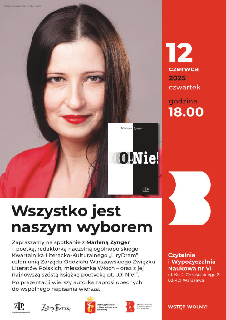 W czwartek 12 czerwca 2025 o godz. 18.00 Czytelnia i Wypożyczalnia Naukowa nr VI zaprasza na spotkanie autorskie z Marleną Zynger pt. Wszystko jest naszym wyborem.
