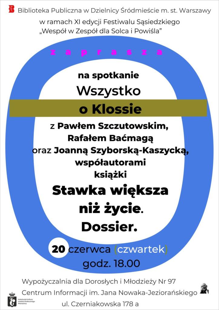 Biblioteka Publiczna w Dzielnicy Śródmieście m.st. Warszawy, w ramach XI edycji Festiwalu Sąsiedzkiego Wespół w Zespół dla Solca i Powiśla, zaprasza na spotkanie pt. „Wszystko o Klossie” z Pawłem Szczutowskim, Rafałem Baćmagą oraz Joanną Szyborską-Kaszycką, współautorami książki „Stawka większa niż życie. Dossier”.