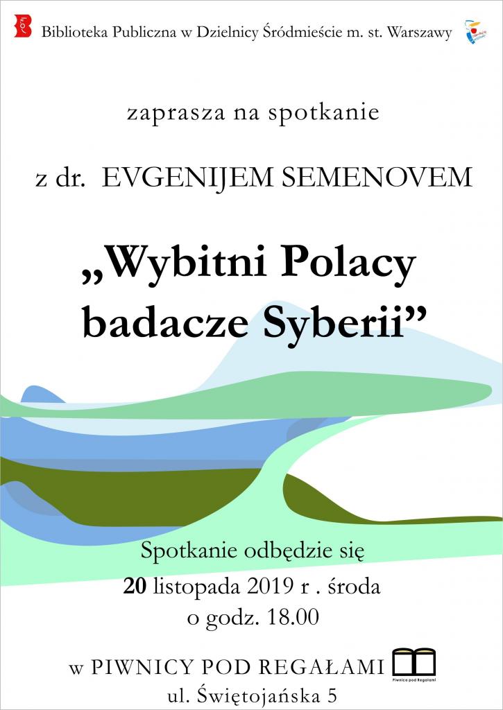Biblioteka Publiczna w Dzielnicy Śródmieście m.st. Warszawy zaprasza w środę 20 listopada o godzinie 18:00 na spotkanie z dr Evgenijem Semenovem pt. „Wybitni Polacy badacze Syberii”. Spotkanie odbędzie się w „Piwnicy pod Regałami” przy ul. Świętojańskiej 5.