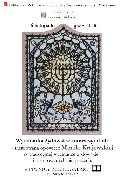 W środę 6 listopada o godzinie 10:00 Klub 5+, działający w Czytelni Naukowej Nr VII, ul. Świętojańska 5, zaprasza do „Piwnicy pod Regałami” na ilustrowaną opowieść Moniki Krajewskiej o tradycyjnej wycinance żydowskiej i inspirowanych nią pracach.