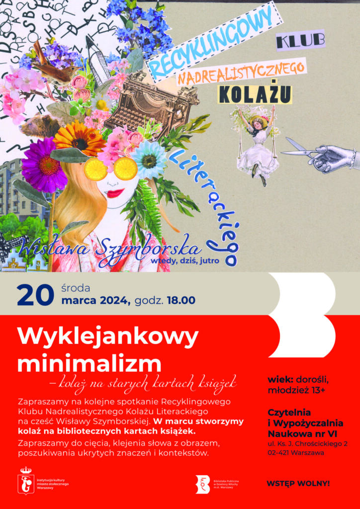 W środę 20 marca 2024 o godz. 18.00 Czytelnia i Wypożyczalnia Naukowa nr VI zaprasza na spotkanie Recyklingowego Klubu Nadrealistycznego Kolażu Literackiego na cześć Wisławy Szymborskiej. Będziemy ciąć, kleić, łączyć słowa i obrazy, poszukiwać ukrytych znaczeń i kontekstów. Tytuł marcowego spotkania brzmi: „Wyklejankowy minimalizm – kolaż na starych kartach książek”.