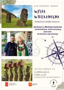 Czytelnia Naukowa nr V, mieszcząca się przy ul. Meissnera 5 serdecznie zaprasza na marcowe spotkanie Klubu Podróżnika „Trampek”, które odbędzie się w piątek 22 marca 2024 r. o godz. 17:00. Gościem wydarzenia „Wyspa Wielkanocna – podróż na koniec świata” będzie kulturoznawca, pisarz i podróżnik Marek Łasisz. Wstęp wolny.