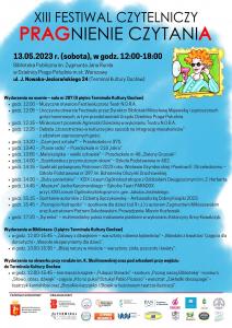 Już po raz XIII Biblioteka Publiczna im. Zygmunta Jana Rumla w Dzielnicy Praga-Południe zaprasza do wspólnego świętowania festiwalu czytelniczego PRAGnienie czytaniA. Hasłem przewodnim tegorocznej edycji jest „Słowo-obraz-dźwięk, czyli korespondencja sztuk”. Uroczyste rozpoczęcie festiwalu odbędzie się 13 maja o godz. 12:00 w siedzibie głównej Biblioteki, przy ul. Jana Nowaka-Jeziorańskiego 24 (II piętro Terminala Kultury Gocław). W programie znajdą się m.in. animacje i kiermasze książek (skwer im. Kamili Skolimowskiej przy budynku Terminala Kultury Gocław oraz na I piętrze w przestrzeni bibliotecznej), a także występy uczniów z placówek oświatowych na Pradze-Południe, spotkania autorskie, koncerty, pokaz malowania piaskiem i inne. Wstęp wolny. Zapraszamy.