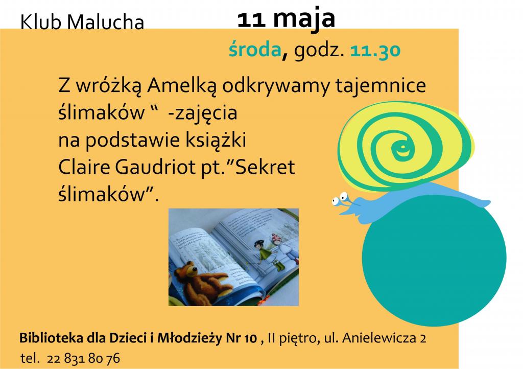 z cyklu Klub Malucha pt. „Z wróżką Amelką odkrywamy tajemnice ślimaków”. Będą to zajęcia na podstawie książki Claire Gaudriot