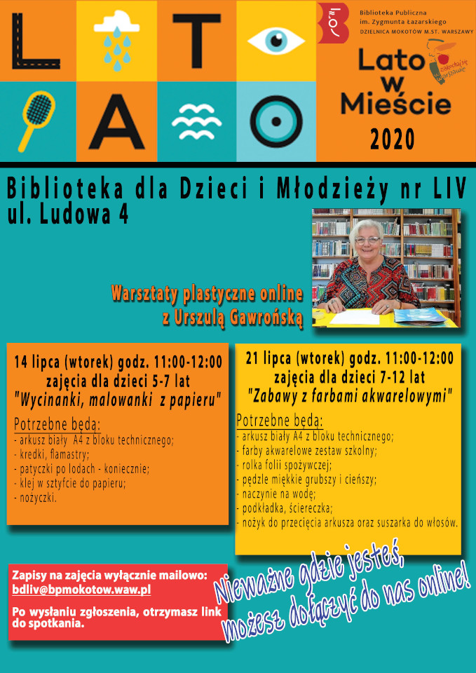 Zajęcia plastyczne on-line w ramach Lata w Mieście 2020 w Bibliotece dla Dzieci i Młodzieży numer LIV o tematyce zabawy z farbami akwarelowymi!