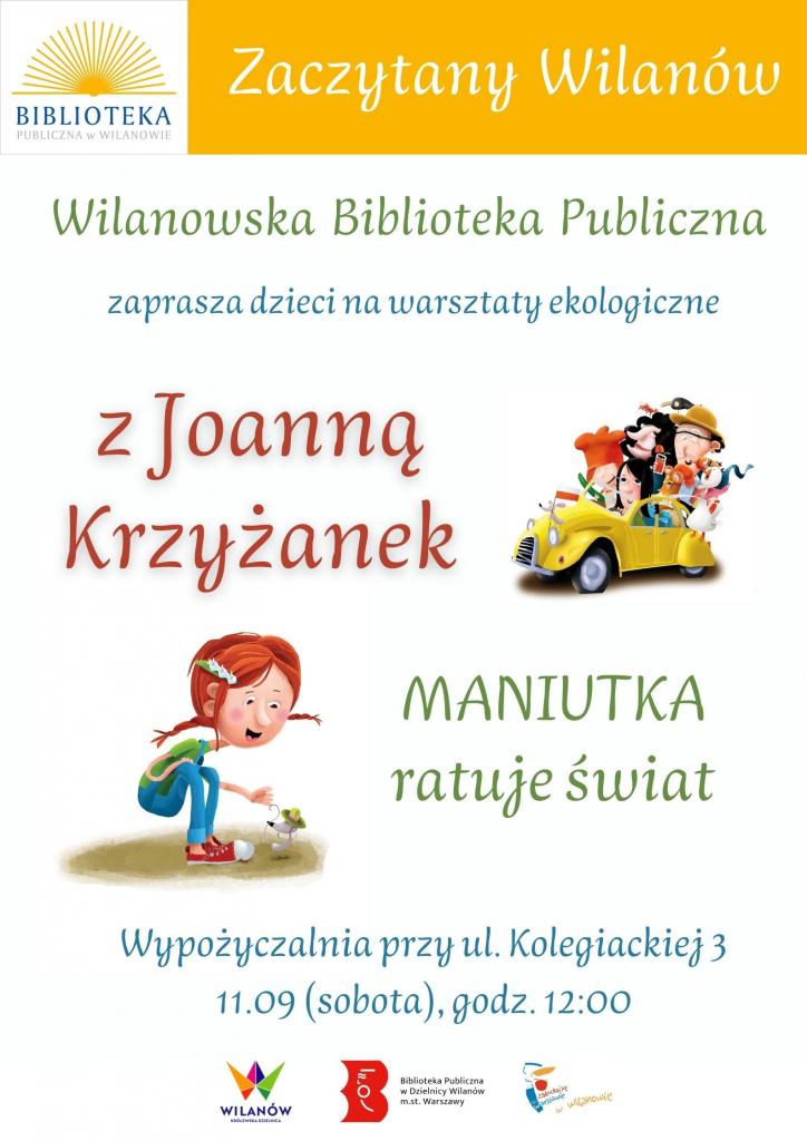 Maniutka mieszkanka Starego Knedelkowa słyszy w telewizji, że nadciąga katastrofa ekologiczna. Wiadomość ta na tyle szokuje dziewczynkę, że postanawia działać. Jak można zaradzić zbliżającej się tragedii? Najlepiej zacząć od siebie i najbliższych. Rezolutna bohaterka wciela w życie plan ratowania planety, który może zrealizować każdy z nas. Przyłączcie się do wielkiej ekologicznej przygody i poznajcie sposoby na bardziej przyjazne Ziemi życie. O tym, jak być eko opowie Wam Joanna Krzyżanek autorka książki „Maniutka ratuje świat”. Pamiętajcie, wielkie rzeczy zaczynają się od małych gestów. Razem możemy zmienić świat!