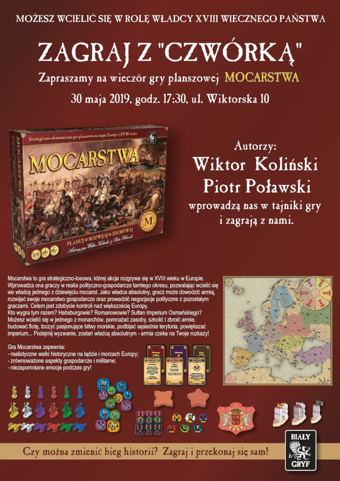 Zapraszamy na wieczorne spotkanie z twórcami gry strategiczno-ekonomicznej '”Mocarstwa” – Wiktorem Kolińskim i Piotrem Poławskim. Twórcy wprowadzą nas w tajniki gry i zagrają z nami!