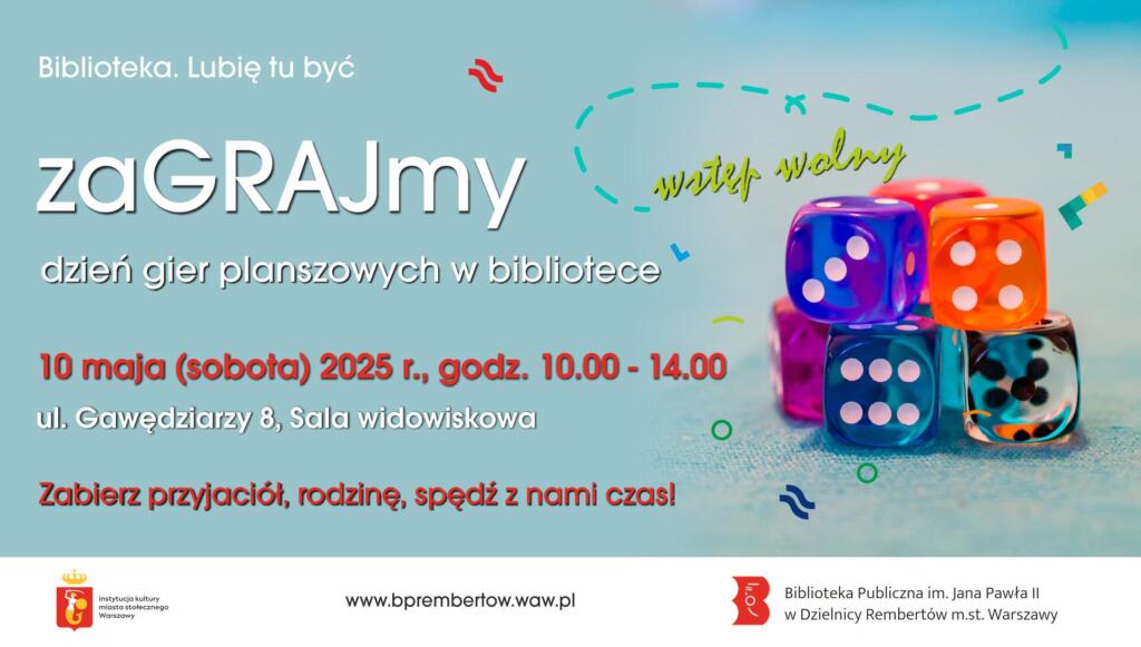 Zagrajmy i zamieńmy bibliotekę w przestrzeń wspólnej zabawy. Wyjątkowe wydarzenie – Dzień Gier Planszowych z okazji Tygodnia Bibliotek odbędzie się w bibliotece przy ul. Gawędziarzy 8 w sobotę, 10 maja, w godzinach 10:00 – 14:00.