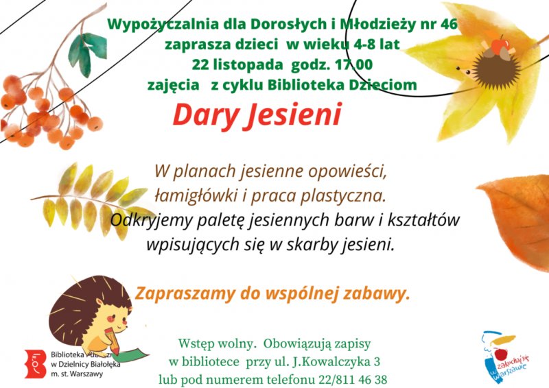 Wypożyczalnia Nr 46 zaprasza maluchy w wieku 4-8 lat na zajęcia plastyczne pt.: „Dary Jesieni”. Wstęp wolny, obowiązują zapisy tel. 22 811-46-38.