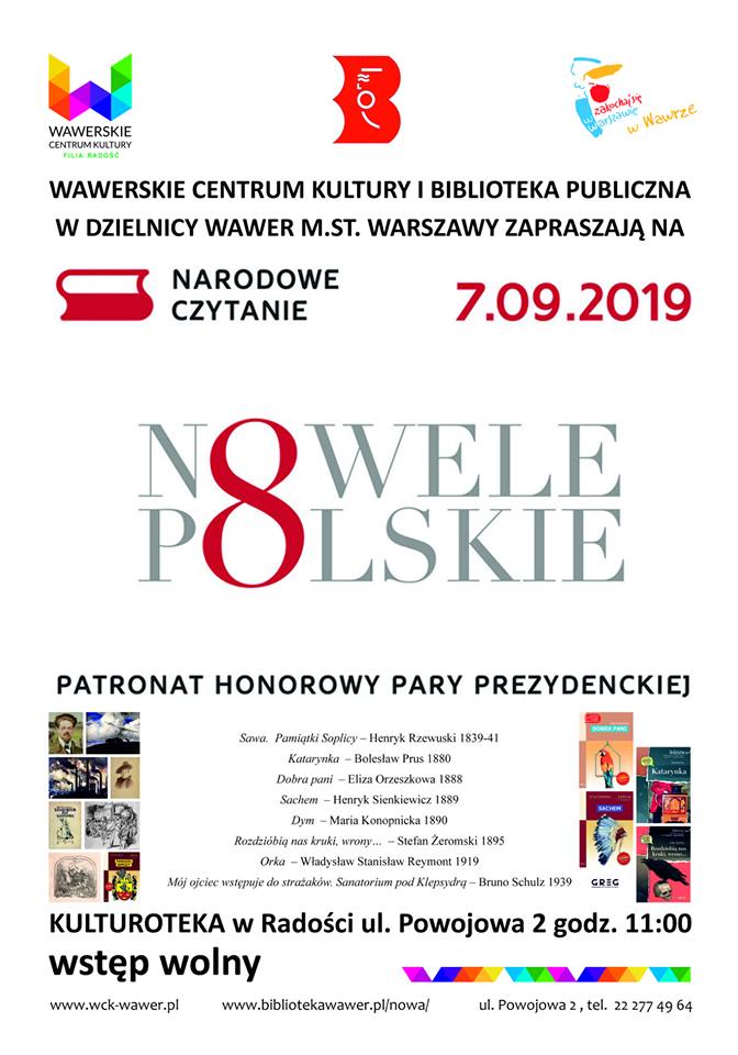 Zapraszamy na Narodowe Czytanie polskich nowel, które odbędzie się 7 września o godzinie 11:00 w Kulturotece, przy ul. Powojowej 2 w Dzielnicy Wawer /Radość/.