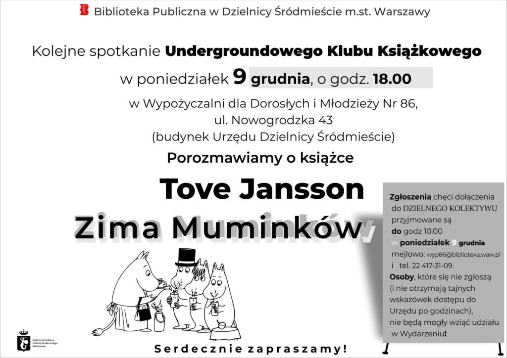 9 grudnia o godzinie 18:00 na spotkanie Undergroundowego Klubu Książkowego. Porozmawiamy o książce „Zima Muminków” Tove Jansson.