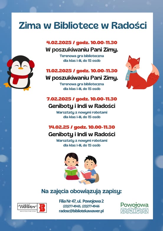 Dokładne terminy zajęć znajdziecie na plakacie. Nie zapomnijcie zapisać się pod adresem mailowym: radosc@bibliotekawawer.pl lub telefonicznie 22 277 49 65🙂
