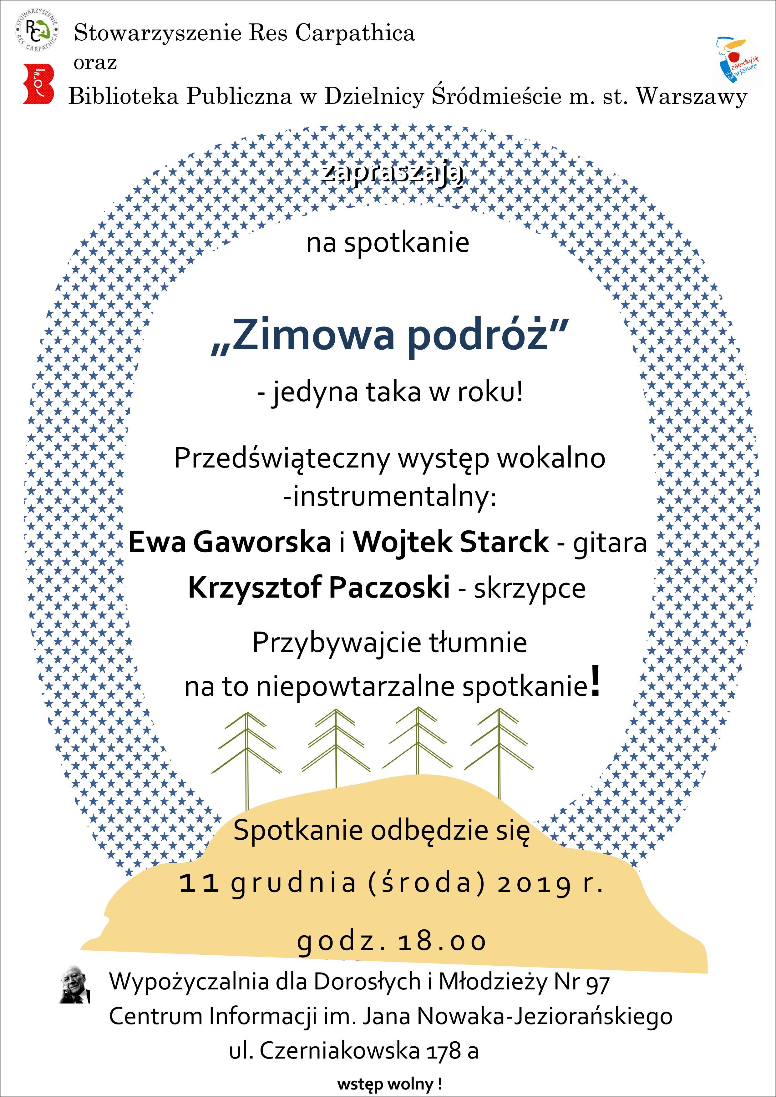 Stowarzyszenie Res Carpathica oraz Biblioteka Publiczna w Dzielnicy Śródmieście m.st. Warszawy, zapraszają w środę 11 grudnia o godzinie 18:00 do Wypożyczalni dla Dorosłych i Młodzieży nr 97 przy ulicy Czerniakowskiej 178A na przedświąteczny występ wokalno-instrumentalny, pt. „Zimowa podróż”.