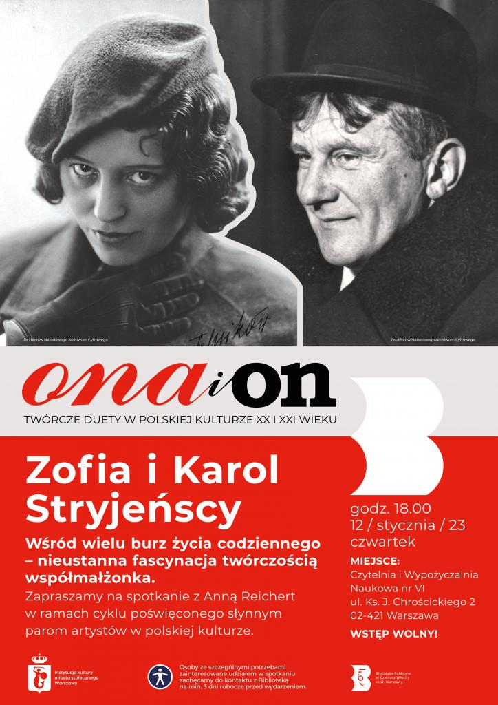 W czwartek 12 stycznia 2023 o godz. 18.00 zapraszamy do Czytelni i Wypożyczalni Naukowej nr VI na kolejne spotkanie z Anną Reichert z cyklu „Ona i On. Twórcze duety w polskiej kulturze XX i XXI wieku”. Temat styczniowego spotkania brzmi: „Zofia i Karol Stryjeńscy. Wśród wielu burz życia codziennego – nieustanna fascynacja twórczością współmałżonka„.