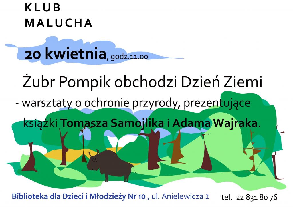 W środę, 20 kwietnia o godzinie 11:00, Biblioteka dla Dzieci i Młodzieży nr 10 przy ulicy Anielewicza 2 zaprasza dzieci wraz z opiekunami na zajęcia z cyklu Klub Malucha pt. „Żubr Pompik obchodzi Dzień Ziemi”. Będą to warsztaty o ochronie przyrody, prezentujące książki Tomasza Samojlika i Adama Wajraka.