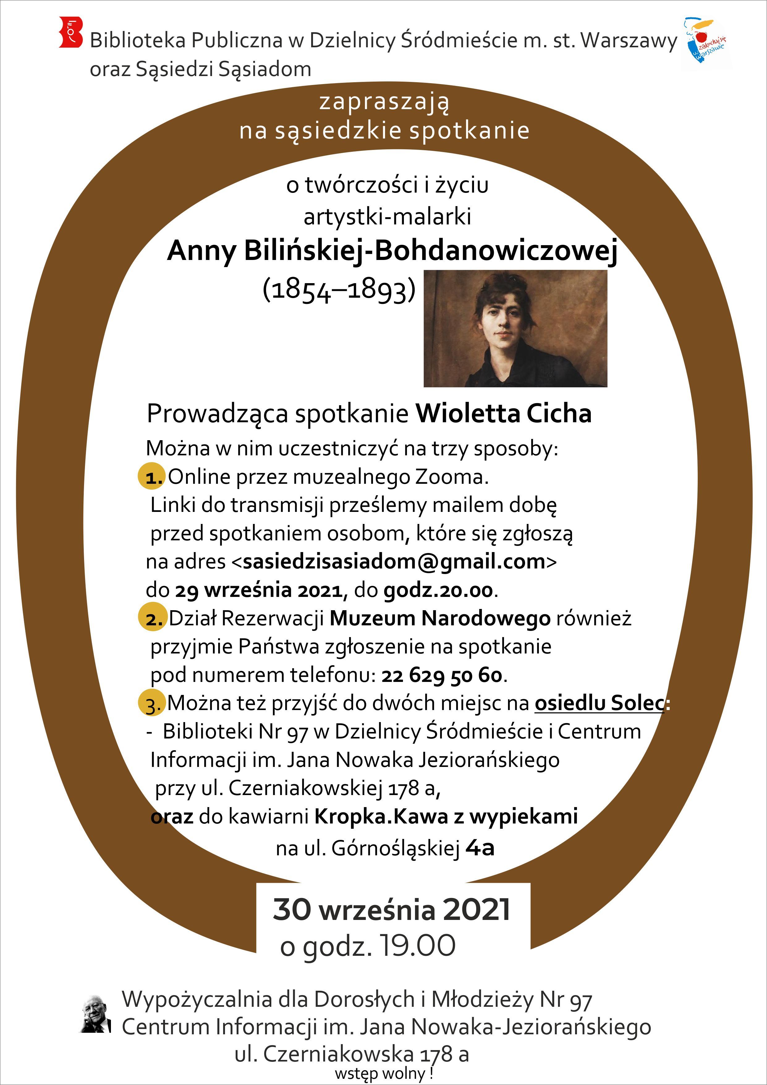 Biblioteka Publiczna w Dzielnicy Śródmieście m.st. Warszawy oraz Sąsiedzi Sąsiadom zapraszają do Wypożyczalni dla Dorosłych i Młodzieży nr 97 i Centrum Informacji im. Jana Nowaka-Jeziorańskiego przy ul. Czerniakowskiej 178a na sąsiedzkie spotkanie online, o twórczości i życiu artystki-malarki Anny Bilińskiej- Bohdanowiczowej (1854-1893).