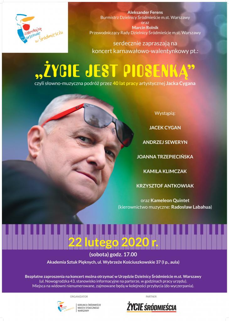 Aleksander Ferens – Burmistrz Dzielnicy Śródmieście m.st. Warszawy oraz Marcin Rolnik – Przewodniczący Rady Dzielnicy Śródmieście m.st. Warszawy, serdecznie zapraszają na koncert karnawałowo-walentynkowy pt. „Życie jest piosenką”, czyli słowno-muzyczna podróż przez 40 lat pracy artystycznej Jacka Cygana.