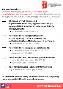 Szanowni Państwo. Z przyjemnością informujemy, że od 2 listopada br. wydłużone zostaną godziny pracy Biblioteki Publicznej w Dzielnicy Praga-Południe. Zachęcamy do zapoznania się z komunikatem.