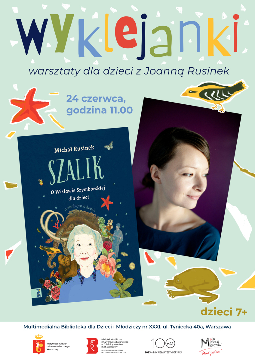 Multimedialna Biblioteka dla Dzieci i Młodzieży nr XXXI zaprasza na „Wyklejanki” – warsztaty z ilustratorką Joanną Rusinek wokół książki „Szalik. O Wisławie Szymborskiej dla dzieci”. Podczas spotkania poznamy pracę ilustratora, stworzymy własne kolaże – wyklejanki – temat dowolny, im bardziej absurdalne, tym lepiej!