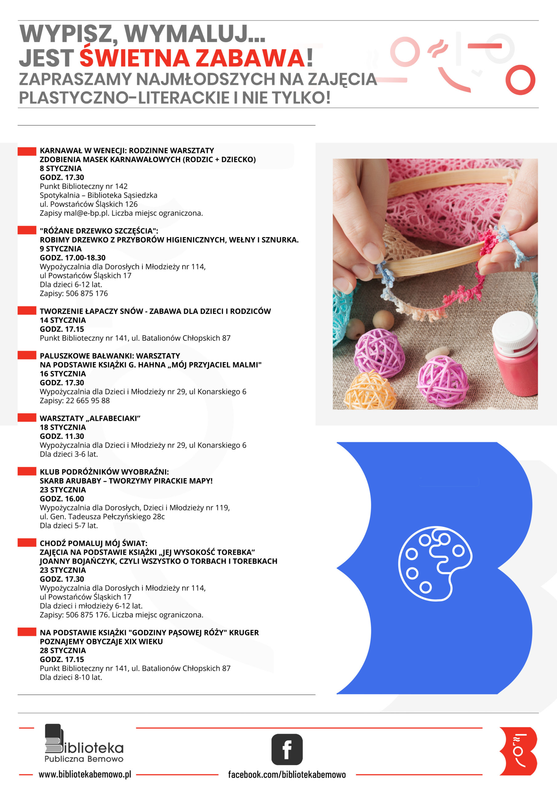 Proponowane w naszych placówkach warsztaty plastyczno-literackie, prowadzone są w formie zabawy. Ich celem jest rozwój i pobudzanie kreatywności najmłodszych czytelników. Podczas spotkań będziemy rozwijać dziecięcą wyobraźnię i zdolności manualne.
