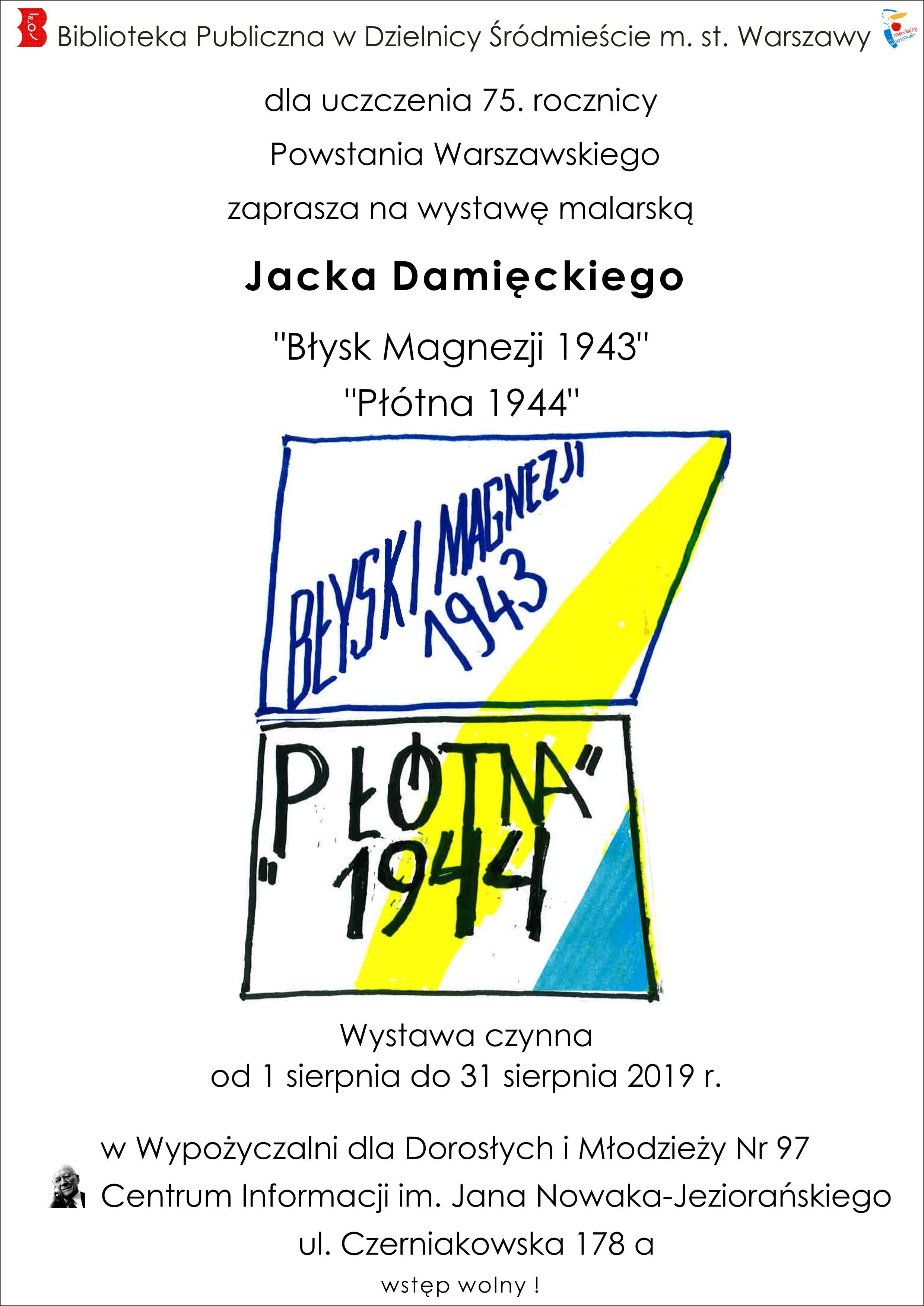 Dla uczczenia 75. rocznicy Powstania Warszawskiego Biblioteka Publiczna w Dzielnicy Śródmieście m.st. Warszawy, zaprasza na wystawę malarską Jacka Damięckiego „Błysk Magnezji 1943” oraz „Płótna 1944”.