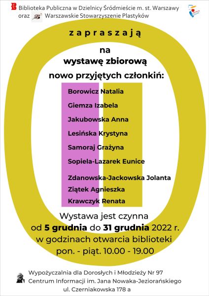 Biblioteka Publiczna w Dzielnicy Śródmieście oraz Warszawskie Stowarzyszenie Plastyków zapraszają na wystawę zbiorową nowo przyjętych członkiń: Borowicz Natalia, Giemza Izabela, Jakubowska Anna, Lesińska Krystyna, Samoraj Grażyna, Sopiela-Lazarek Eunice, Zdanowska-Jackowska Jolanta, Ziątek Agnieszka, Krawczyk Renata.