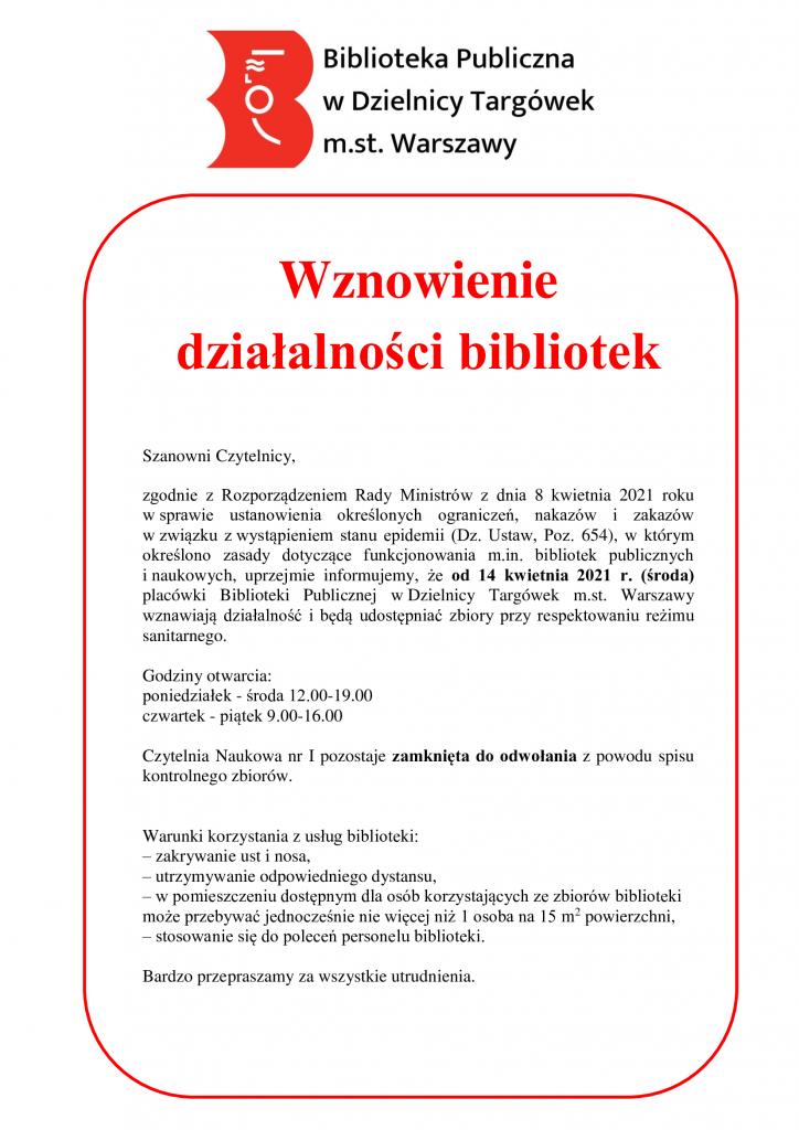Aktualności / Wznowienie działalności bibliotek na Targówku